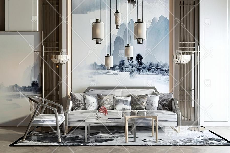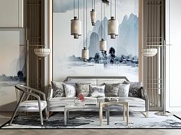 新中式沙发茶几组合 水墨山水画中式背景墙