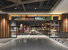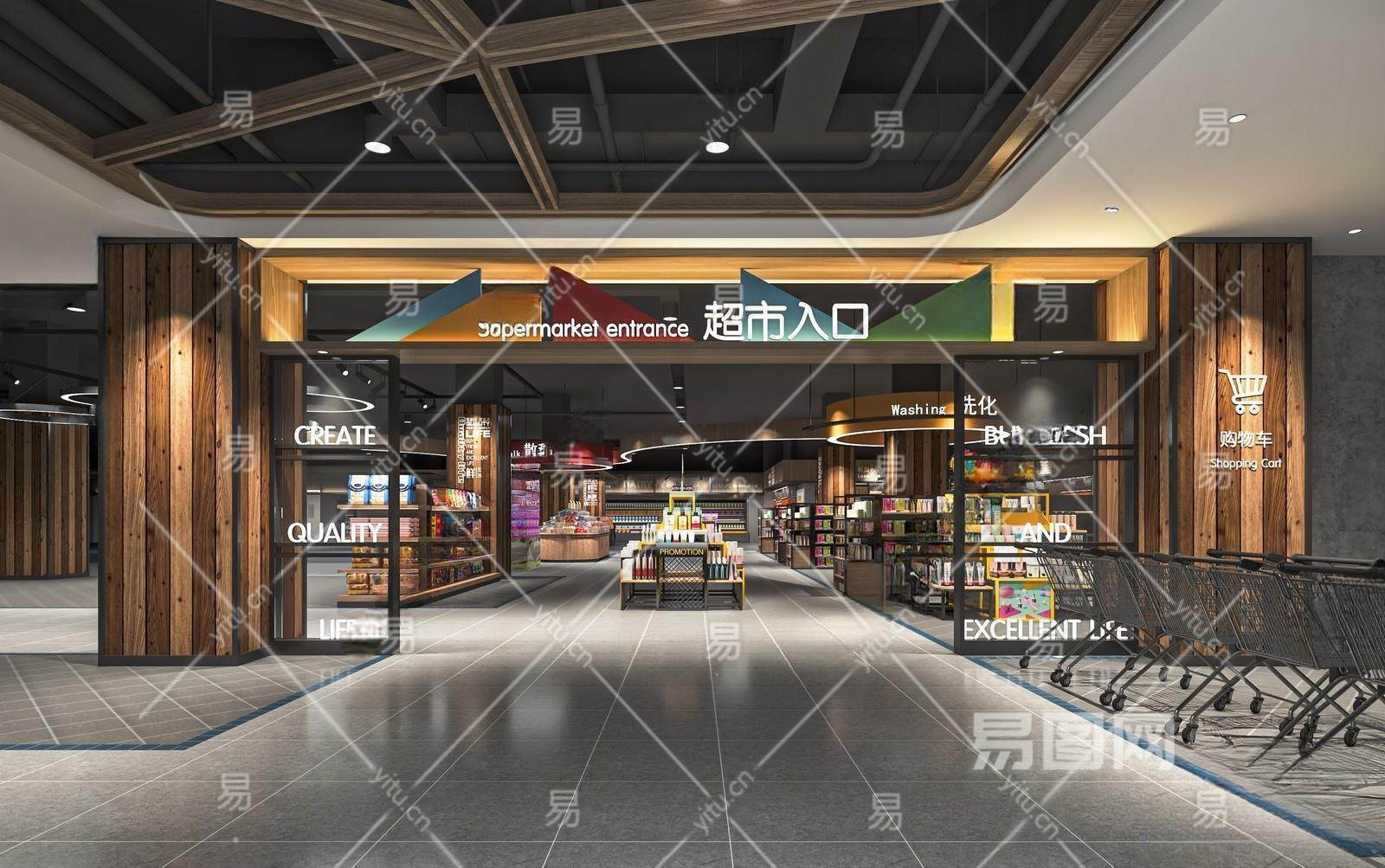 现代超市 超市出入口门头 生鲜超市 便利店 货架 展架