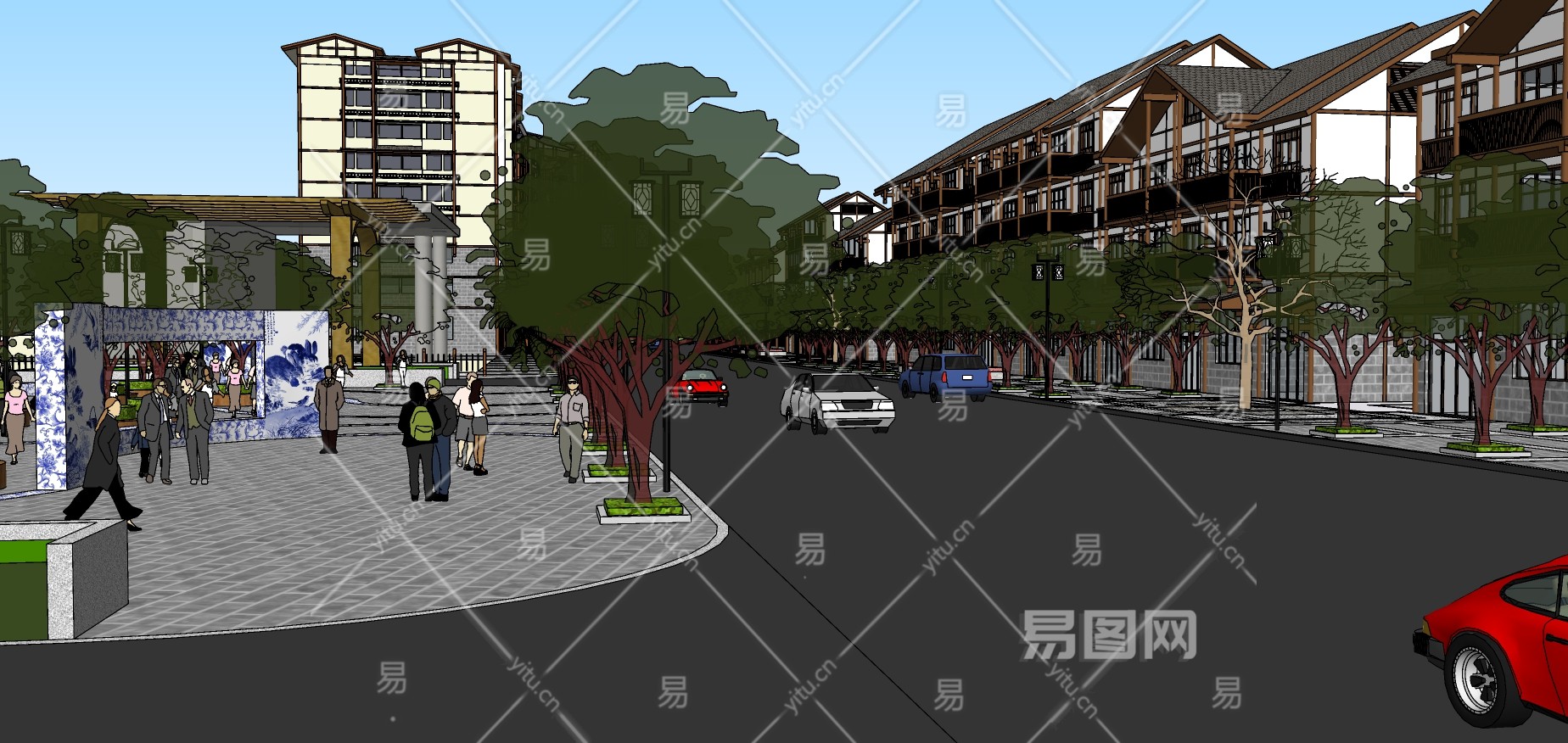 42中式东南亚街道改造,瓷器文化墙,牌坊,中式商业街,旅游景点酒店(1)su草图模型下载