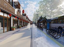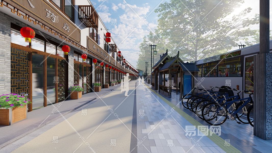 新中式商业街 道路 商铺 人行道 盲道 市政道路 特色街区 公交站