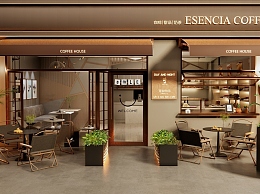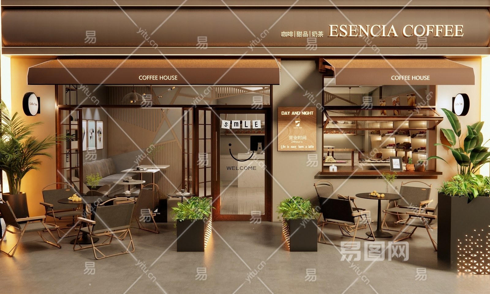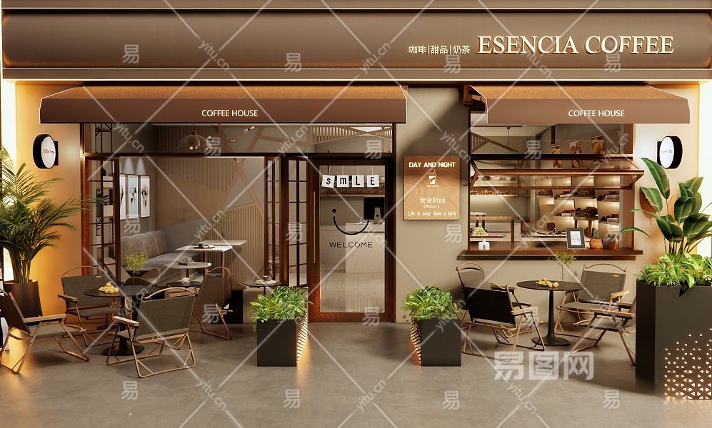 现代咖啡厅门头门面 外摆 户外桌椅 花箱 植物盆栽 餐饮