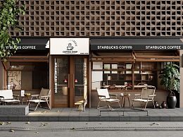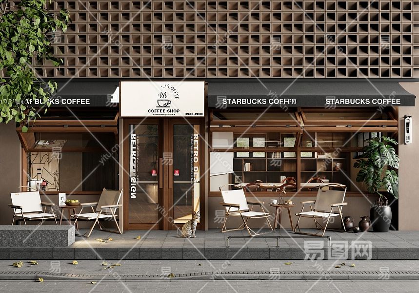 现代咖啡厅门头门面 户外桌椅 折叠窗 店铺招牌 遮阳棚 盆栽 餐饮