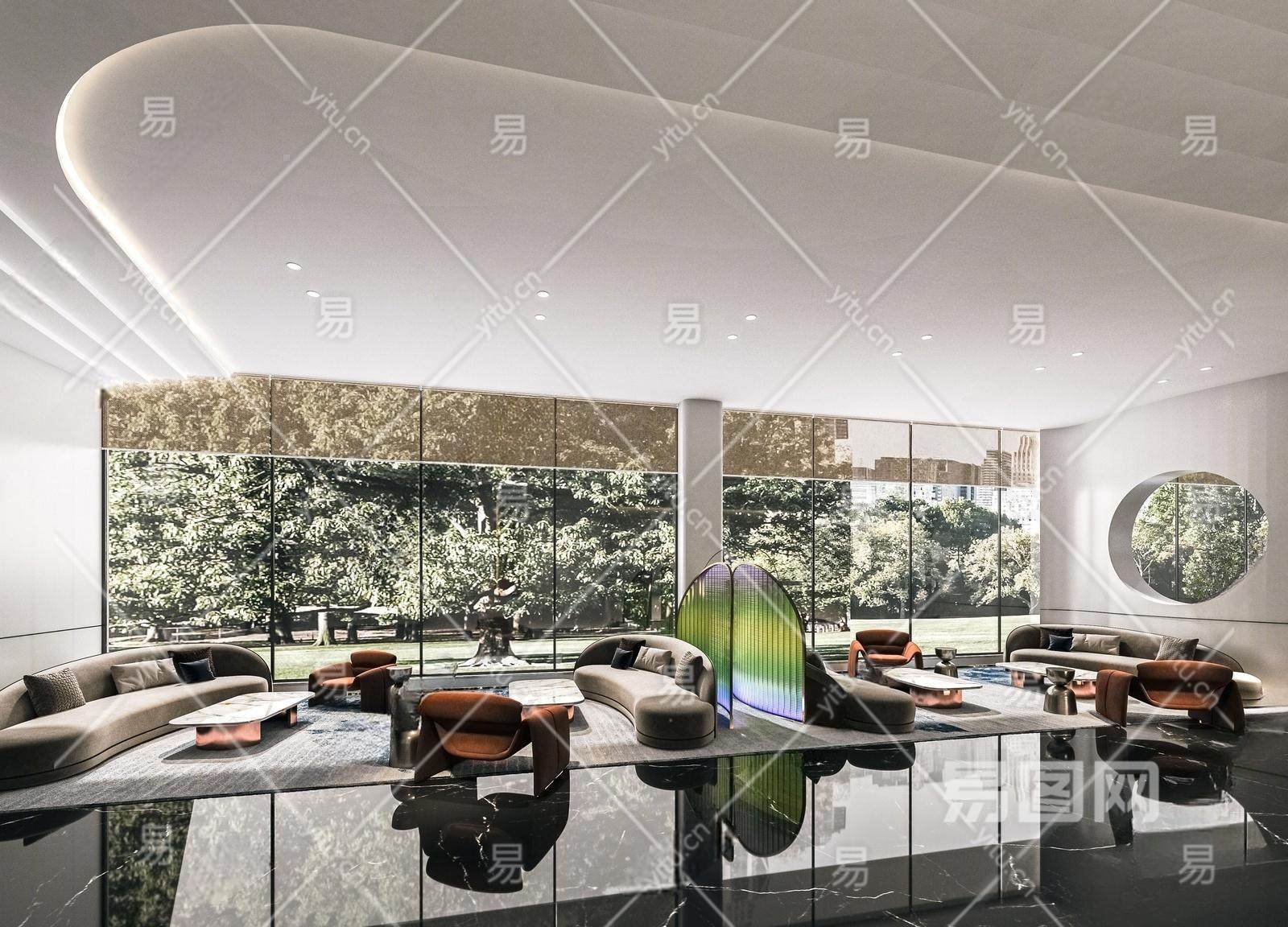 现代售楼处洽谈区 沙发茶几组合 艺术吊灯 展示柜 装饰柜