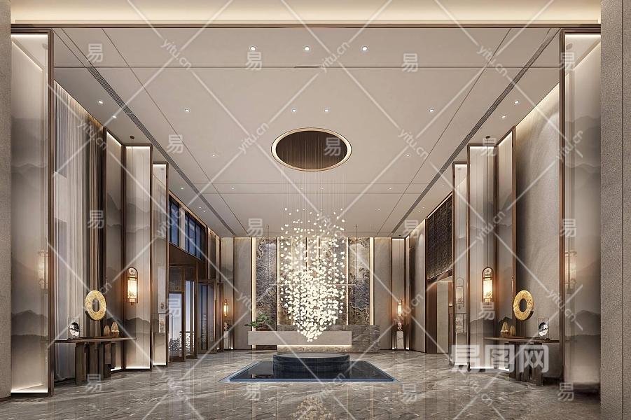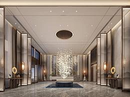 现代酒店大堂 接待大厅 前台 等候区 艺术吊灯 前台背景墙