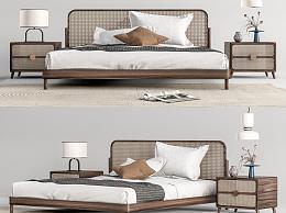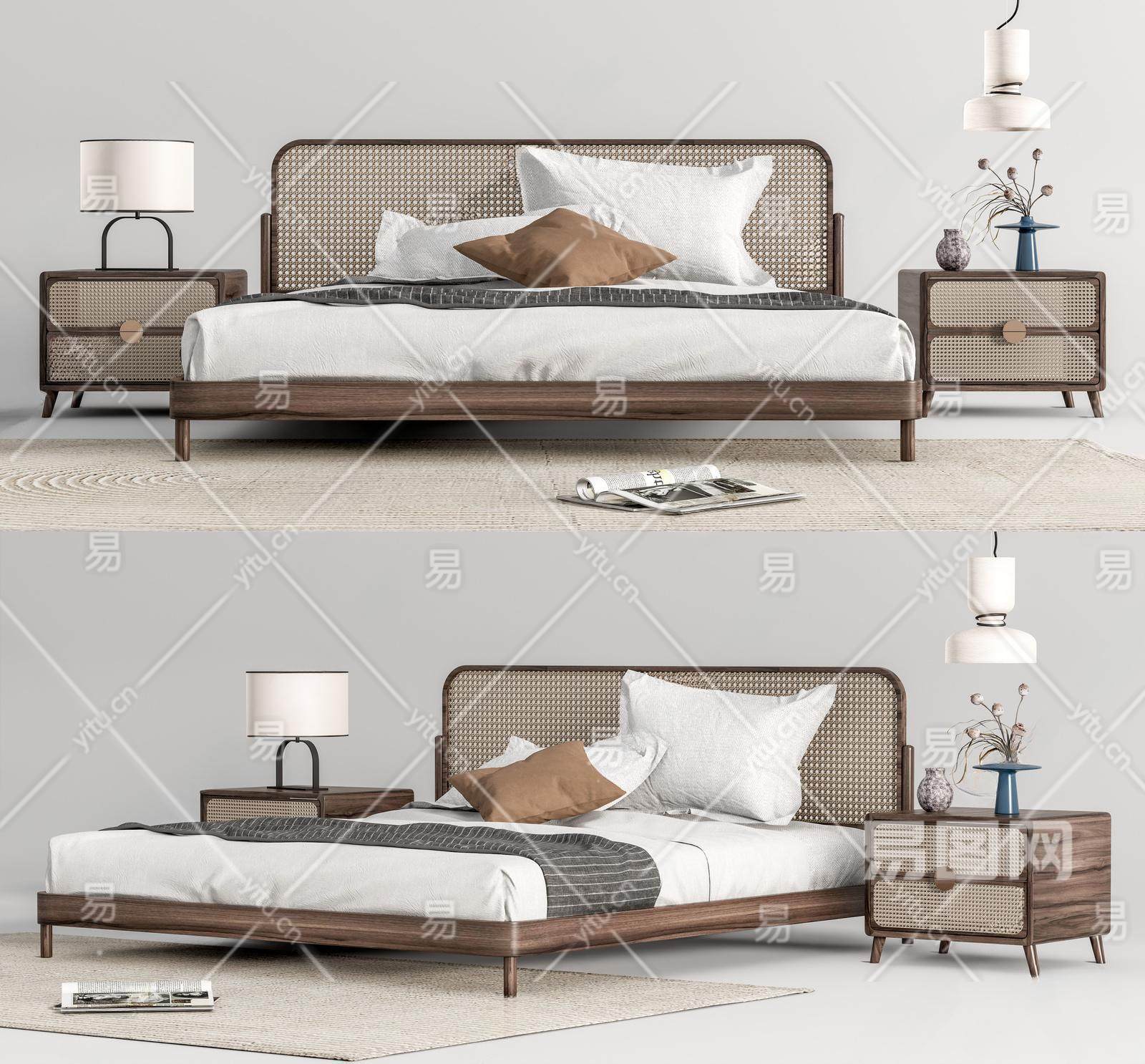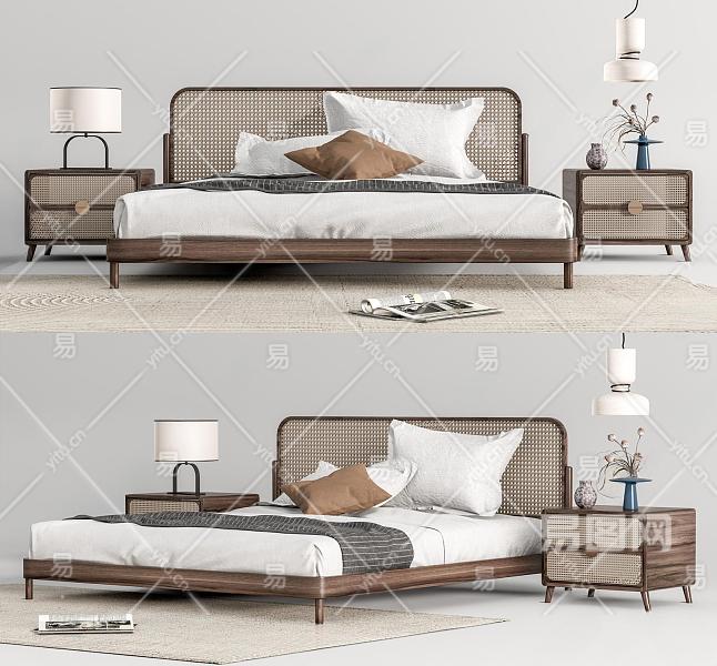 侘寂藤编双人床 床头柜 吊灯 地毯 摆件