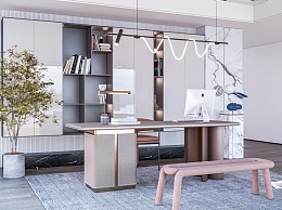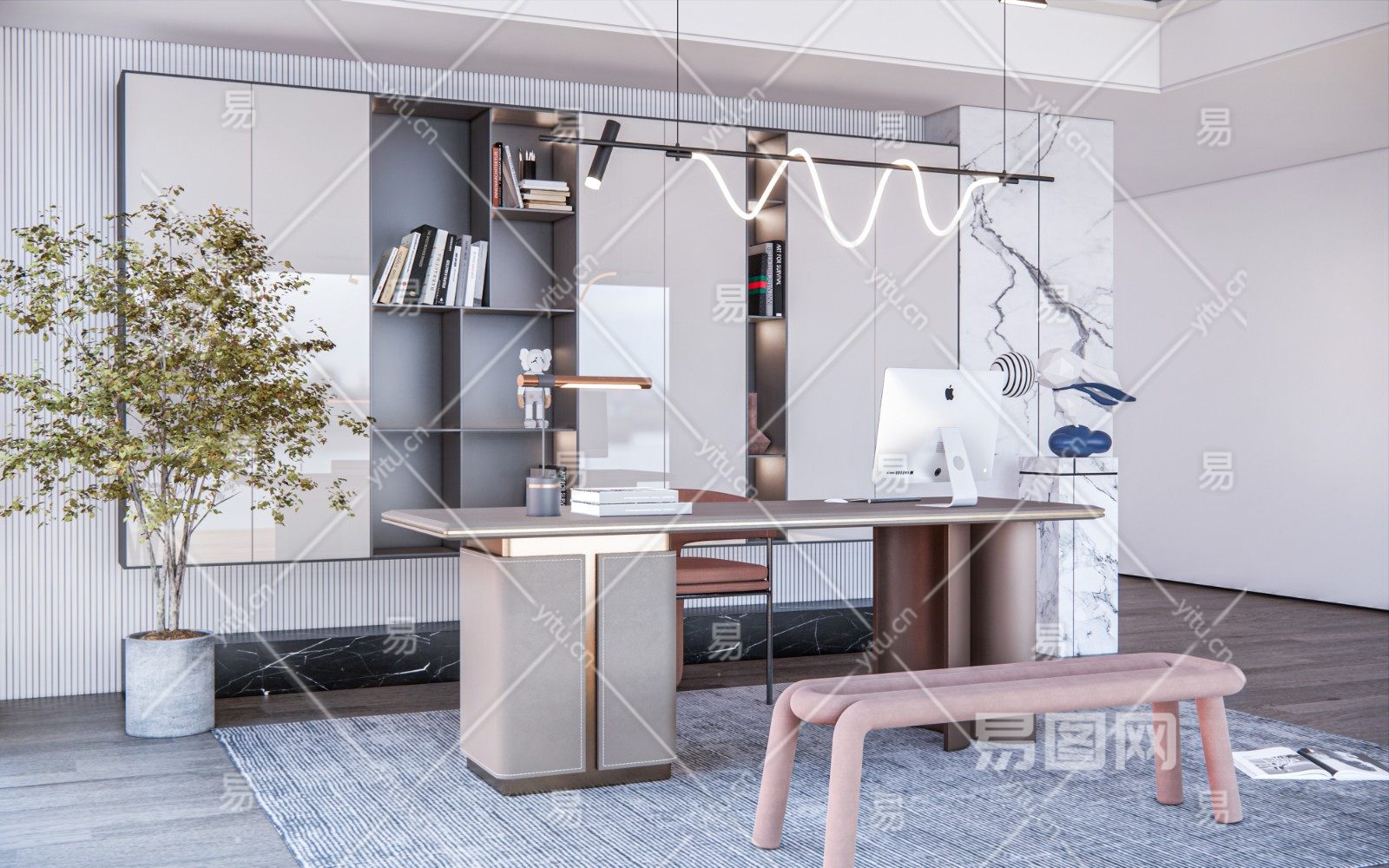 现代书房 书桌 书柜 办公桌 办公家具 盆栽 植物 吊灯