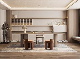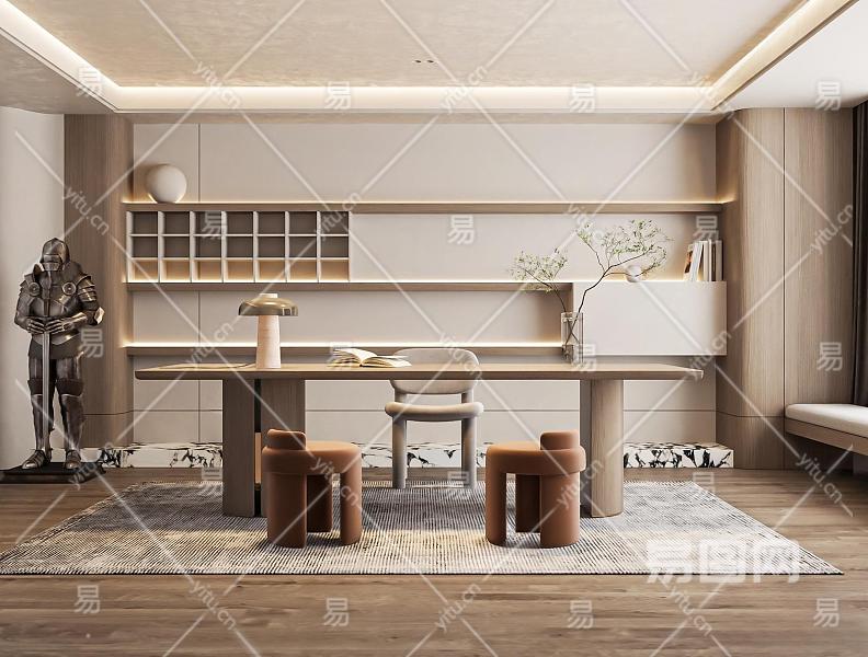 侘寂风书房 书桌椅 写字台 书桌 书柜 办公桌 休闲椅 吊灯 装饰柜