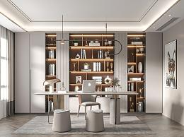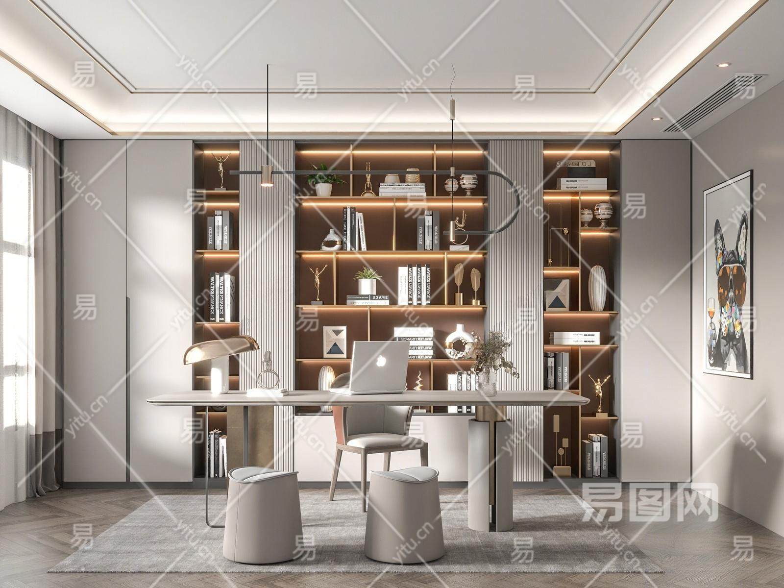 现代轻奢书房 书桌椅组合 圆凳 吊灯 书柜 装饰画 台灯 摆件 书刊