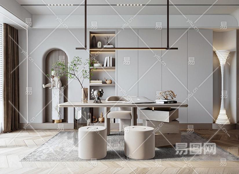 现代书房 书桌椅 书桌 办公桌椅 单椅 雕塑摆件 落地灯 背景墙