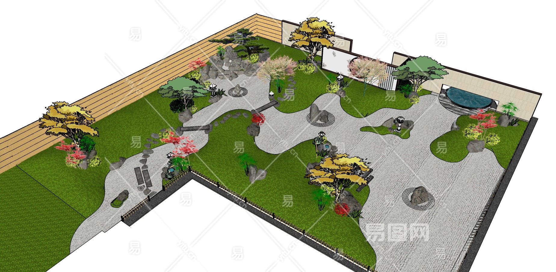 27日式枯山水庭院景观 假山 石头 禅意 庭院景观小品 石头町步 石头小路 樱花树 松树 日式地灯 草坪灯su草图模型下载