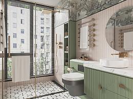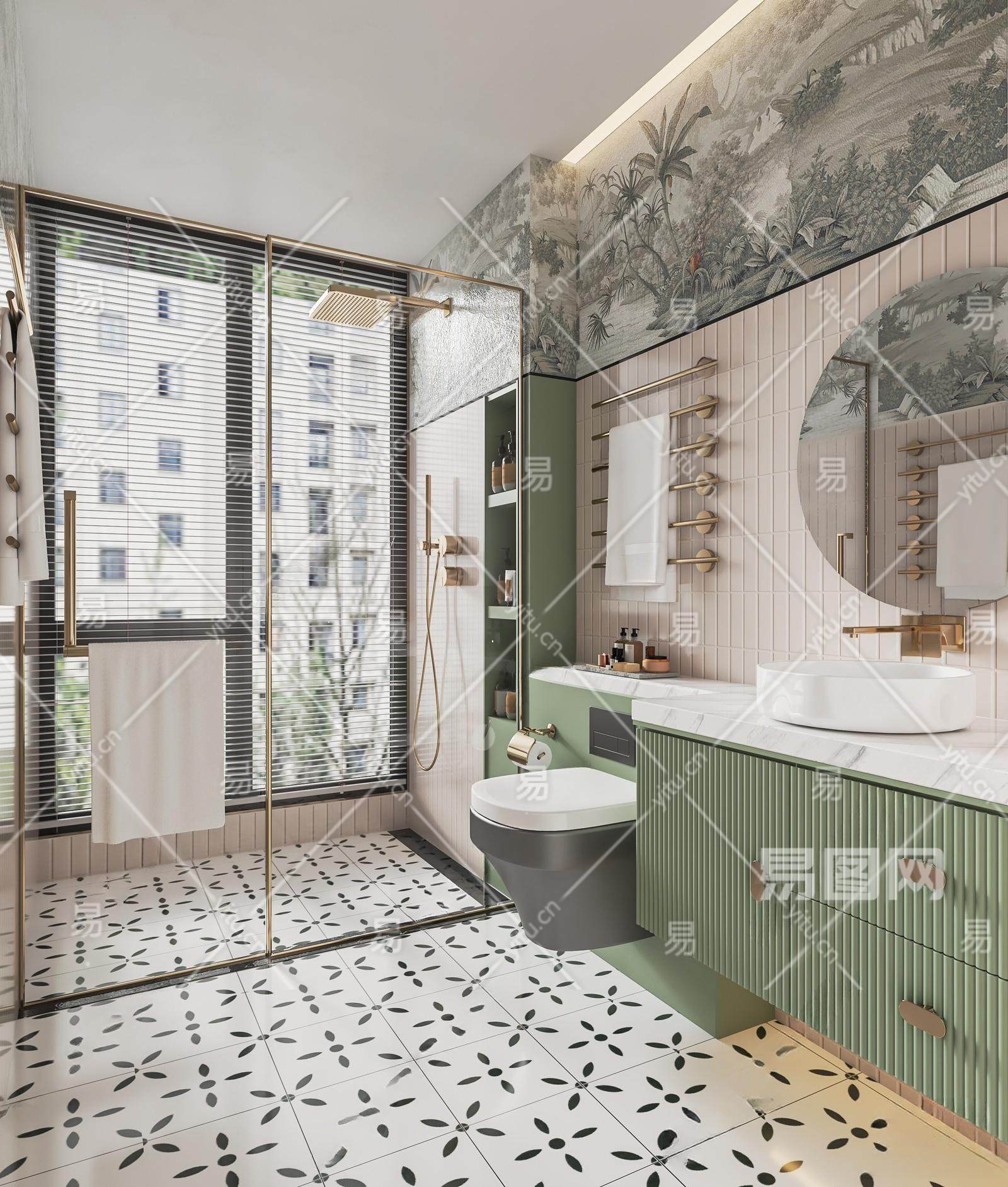 法式卫生间 卫浴 暖气片 淋浴隔断 镜子 洗手台 马桶 洗衣机 淋浴间