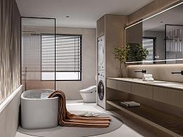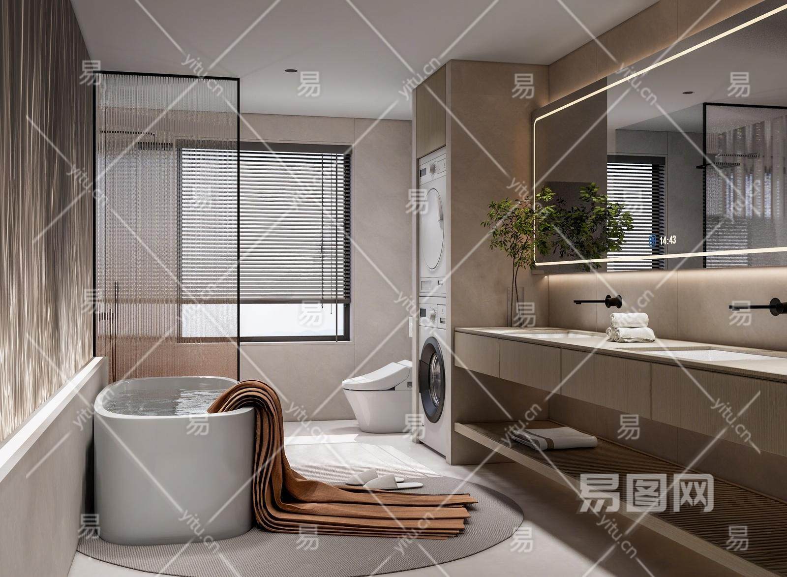 现代卫生间 台盆柜 浴缸 马桶 淋浴房 洗衣机烘干机 镜子