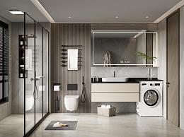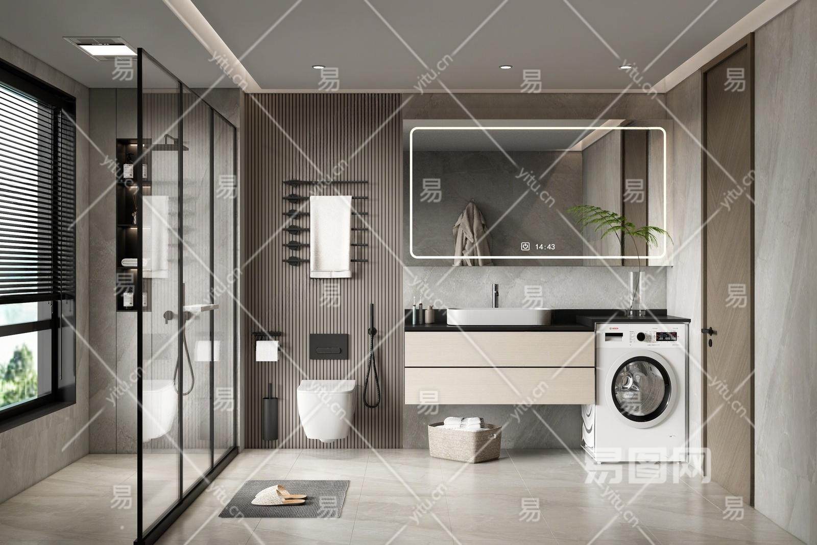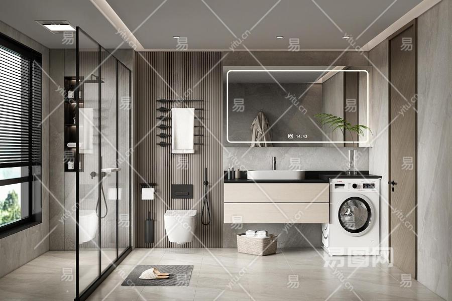 现代卫生间 台盆柜洗衣机 镜子 淋浴房花洒 毛巾架