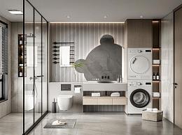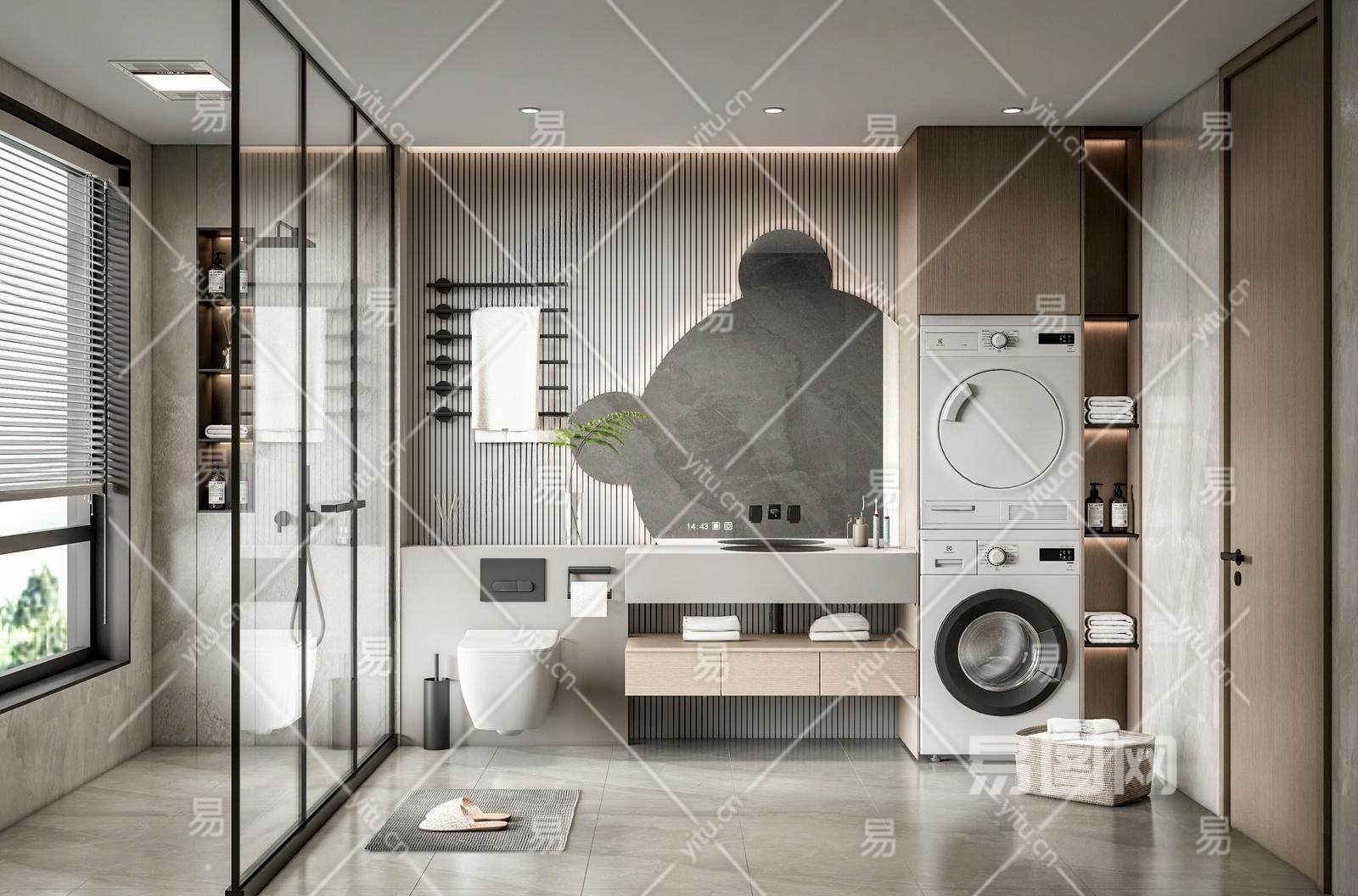 现代卫生间 台盆柜镜子 洗衣机烘干机 淋浴房花洒 马桶 浴品摆件