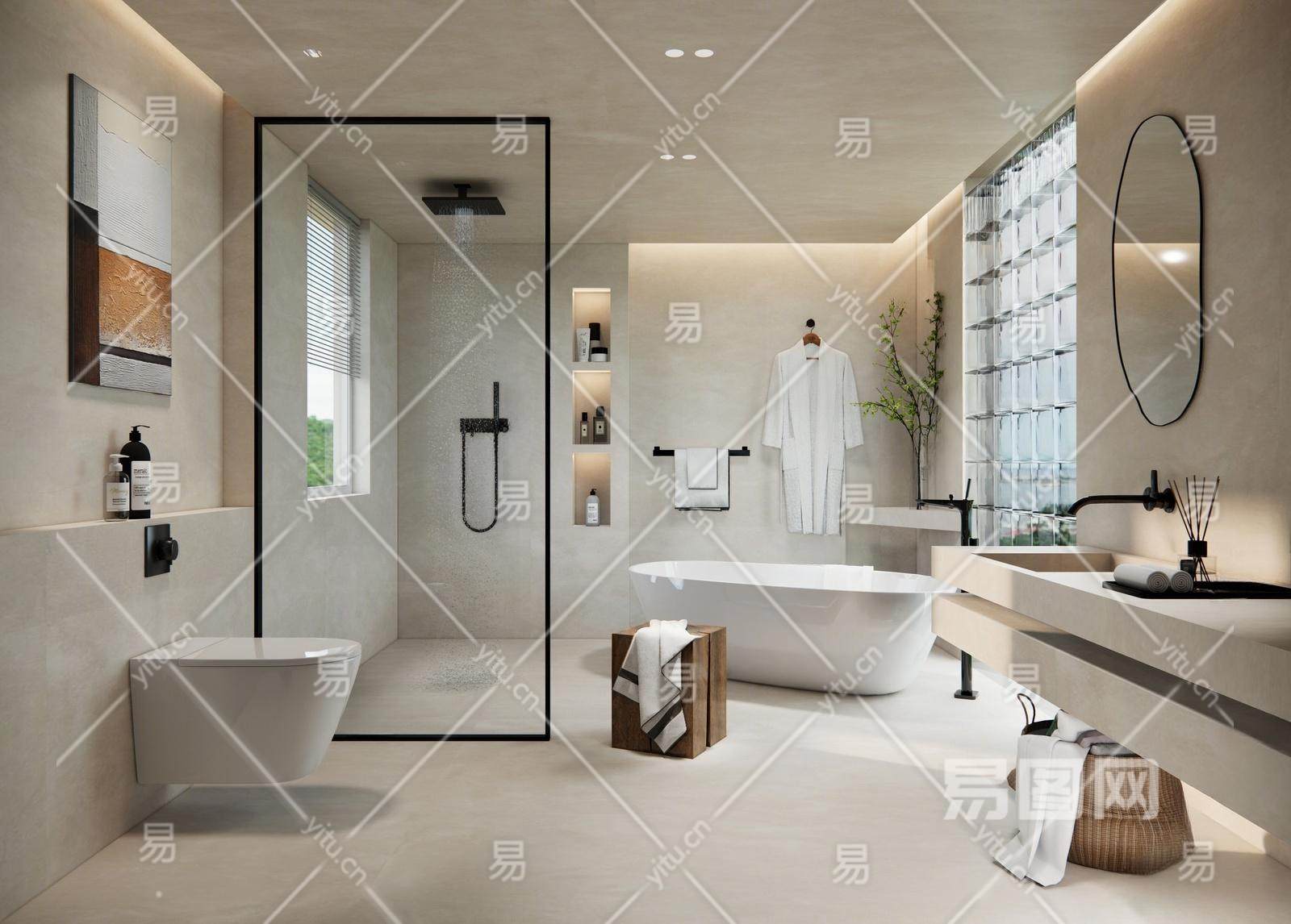 现代卫生间 洗手间 马桶 浴缸 洗漱用品 浴袍 毛巾 脏衣篓 木凳