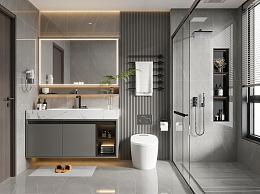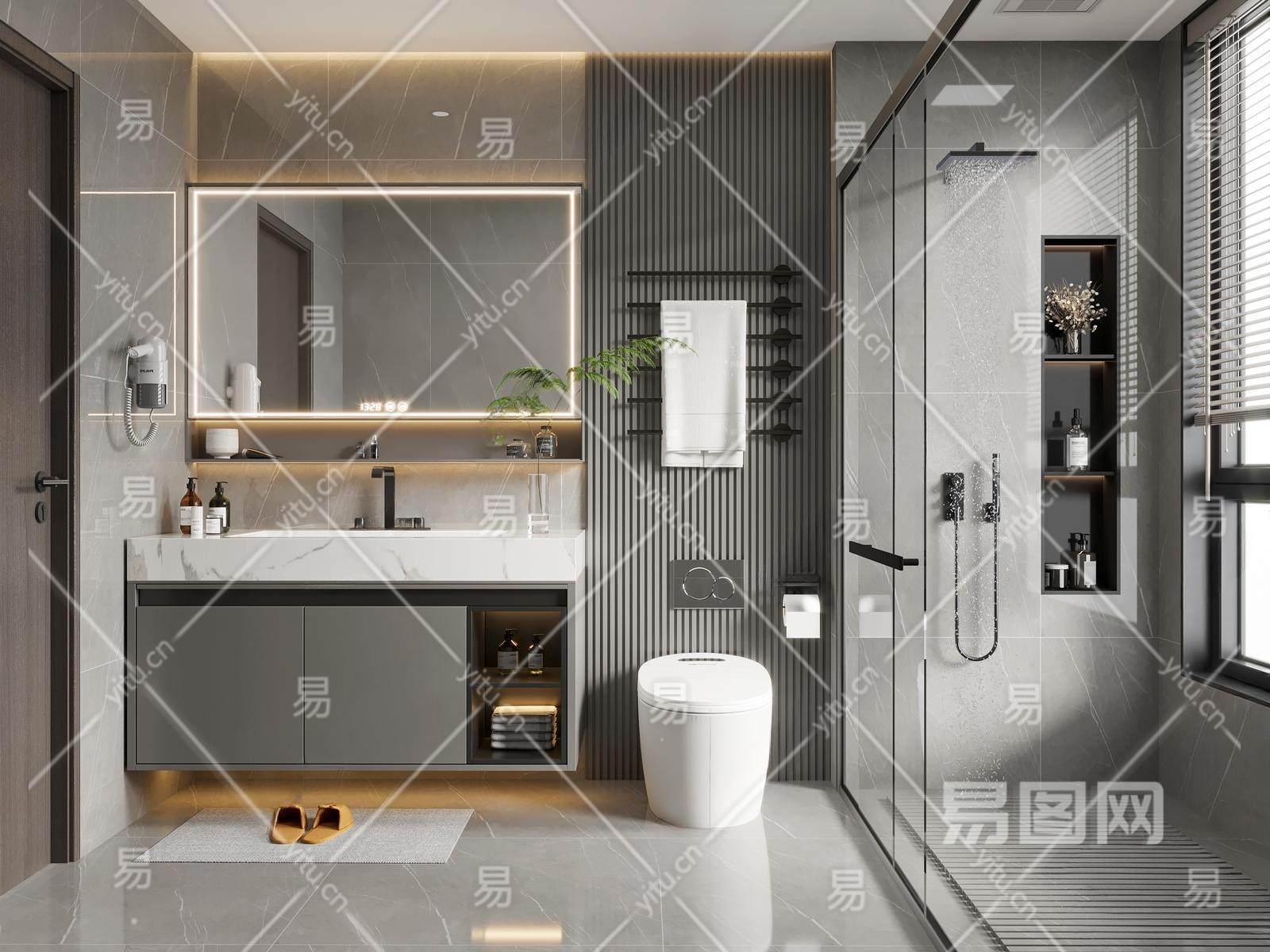 现代卫生间 花洒 洗手盆 马桶 洗护用品 毛巾架 绿植