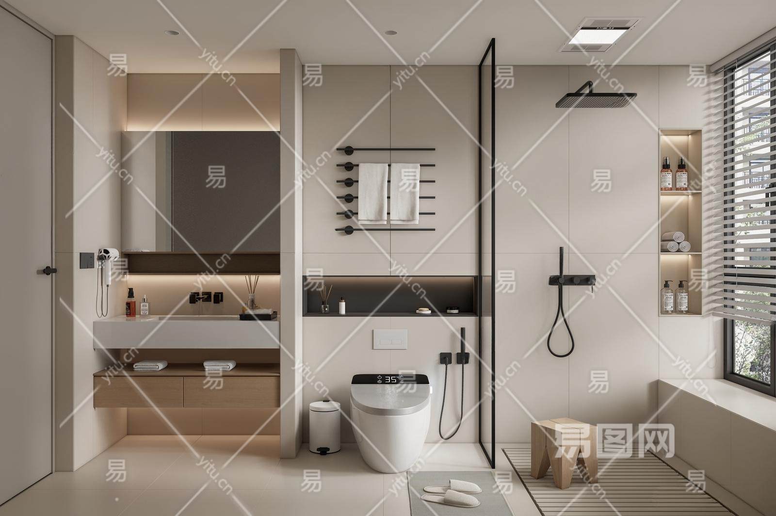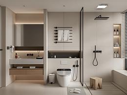 现代卫生间 马桶 洗手台 花洒 毛巾架 镜子 浴品摆件 台盆