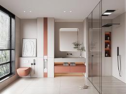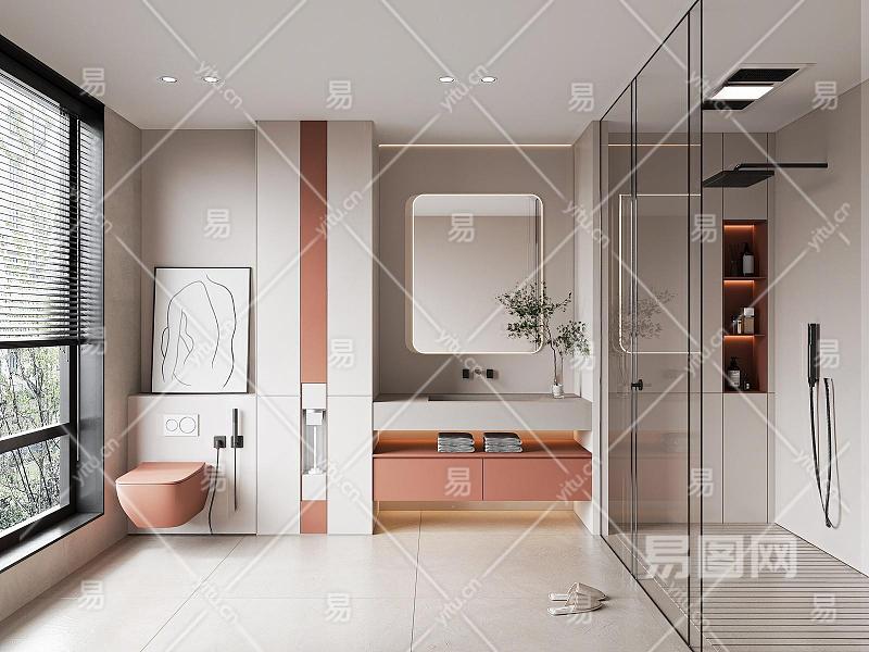 现代奶油风卫生间 浴室 洗手台 挂壁马桶 卫生间用品 淋浴花洒