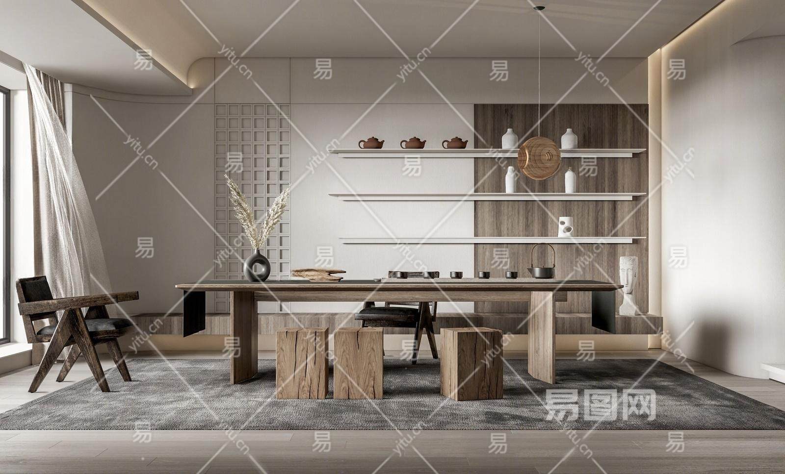 侘寂风书房茶室 书桌椅组合 摆柜 吊灯 休闲椅 茶具