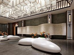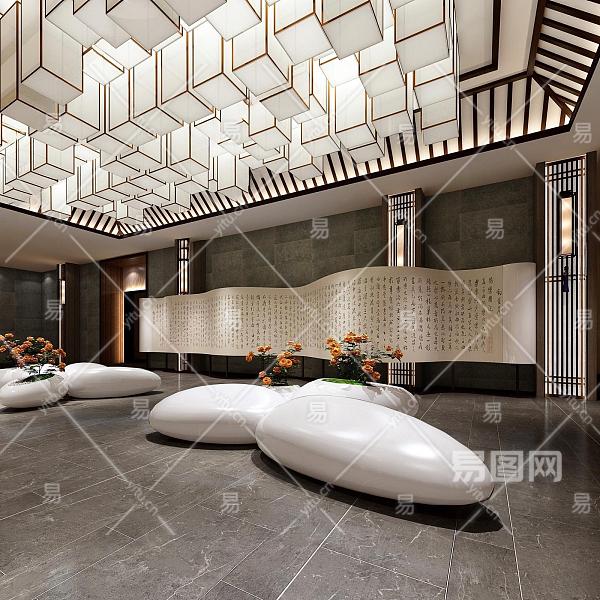 新中式博物馆 休息过道 博物馆吊灯 灯箱吊顶 异形休息坐凳 博物馆休息区 连环字画