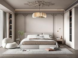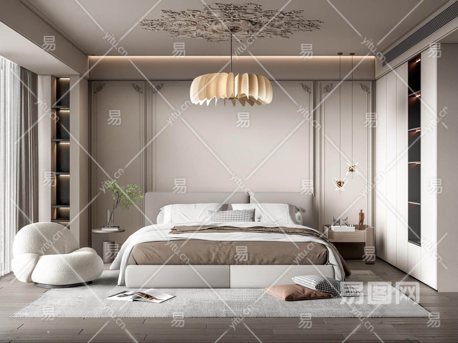 法式轻奢卧室 双人床 床头柜 吊灯 单人沙发 衣柜 雕花护墙板