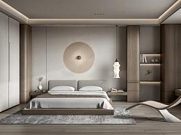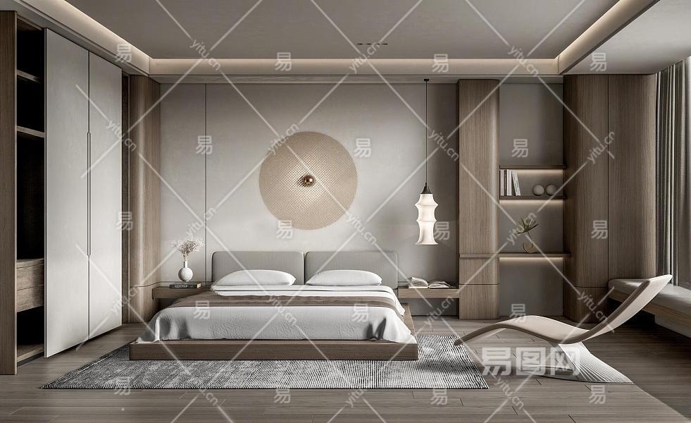 侘寂卧室 双人床 床头柜 吊灯 休闲椅 衣柜 墙饰壁灯 躺椅 花瓶摆件