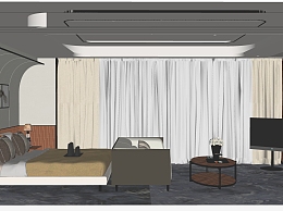 现代风卧室su模型,卧室床窗帘组合草图大师模型下载
