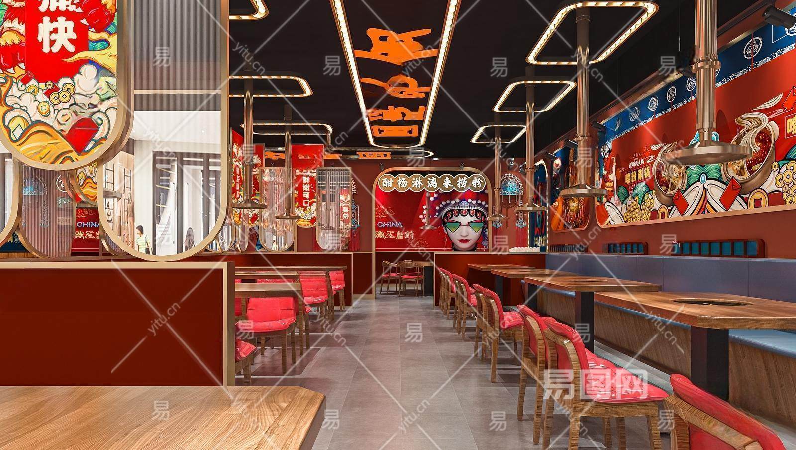 新中式国潮烤肉店 国潮餐厅 饭店 烤肉餐桌椅 收银台 矮隔断