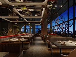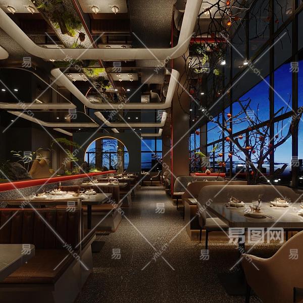现代风格中餐厅 餐桌椅组合 卡座 绿植