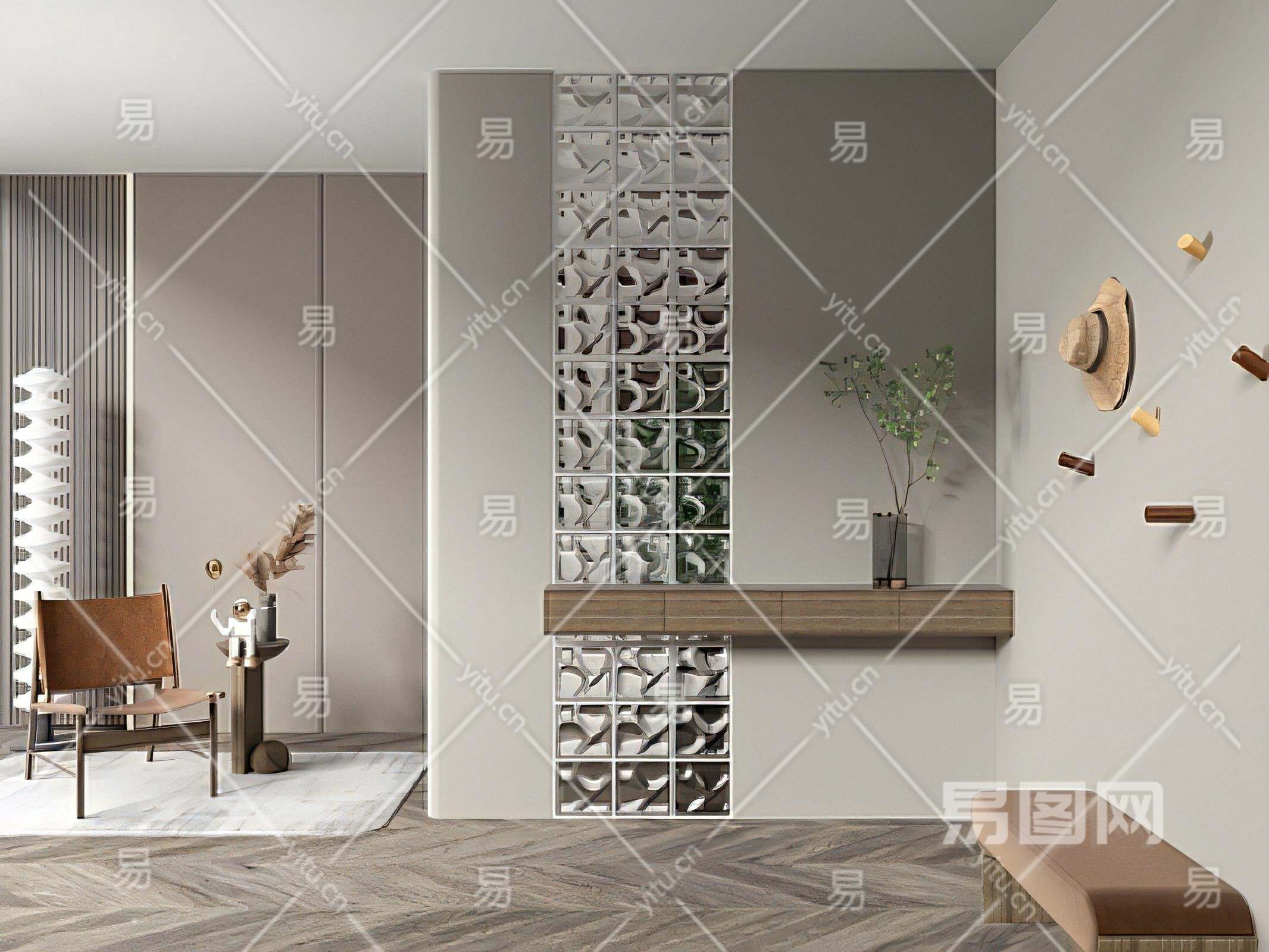 现代装饰性玄关端景台玄关柜休闲椅落地灯花瓶摆件圆几长凳SU模型