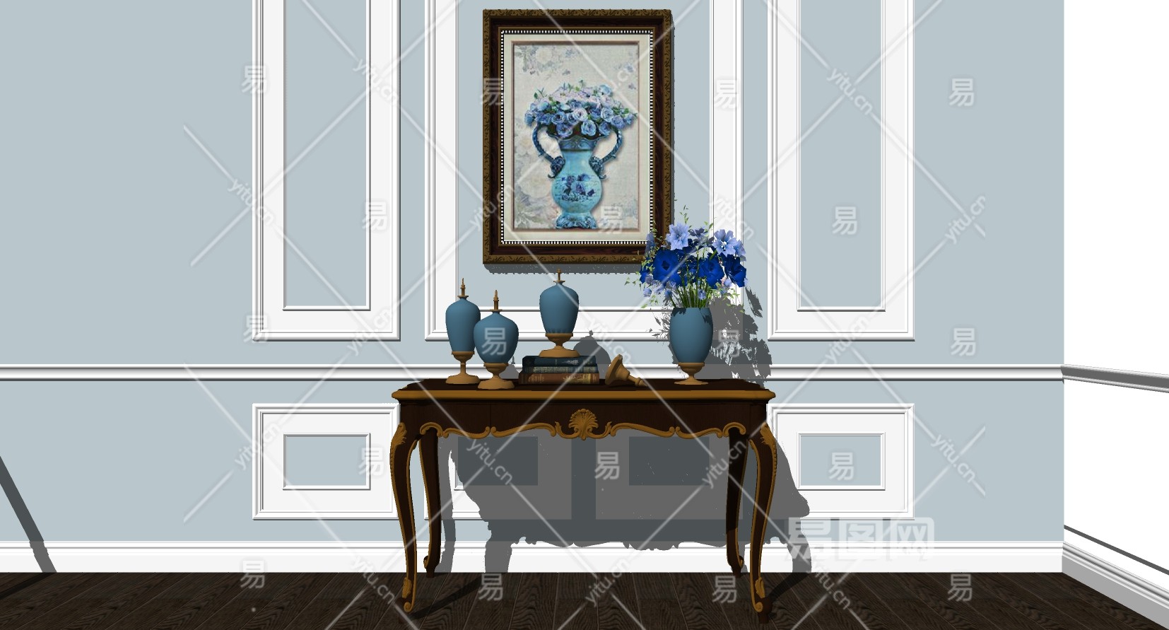 欧式实木雕花端景条案 摆件挂画su草图模型下载