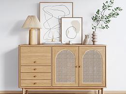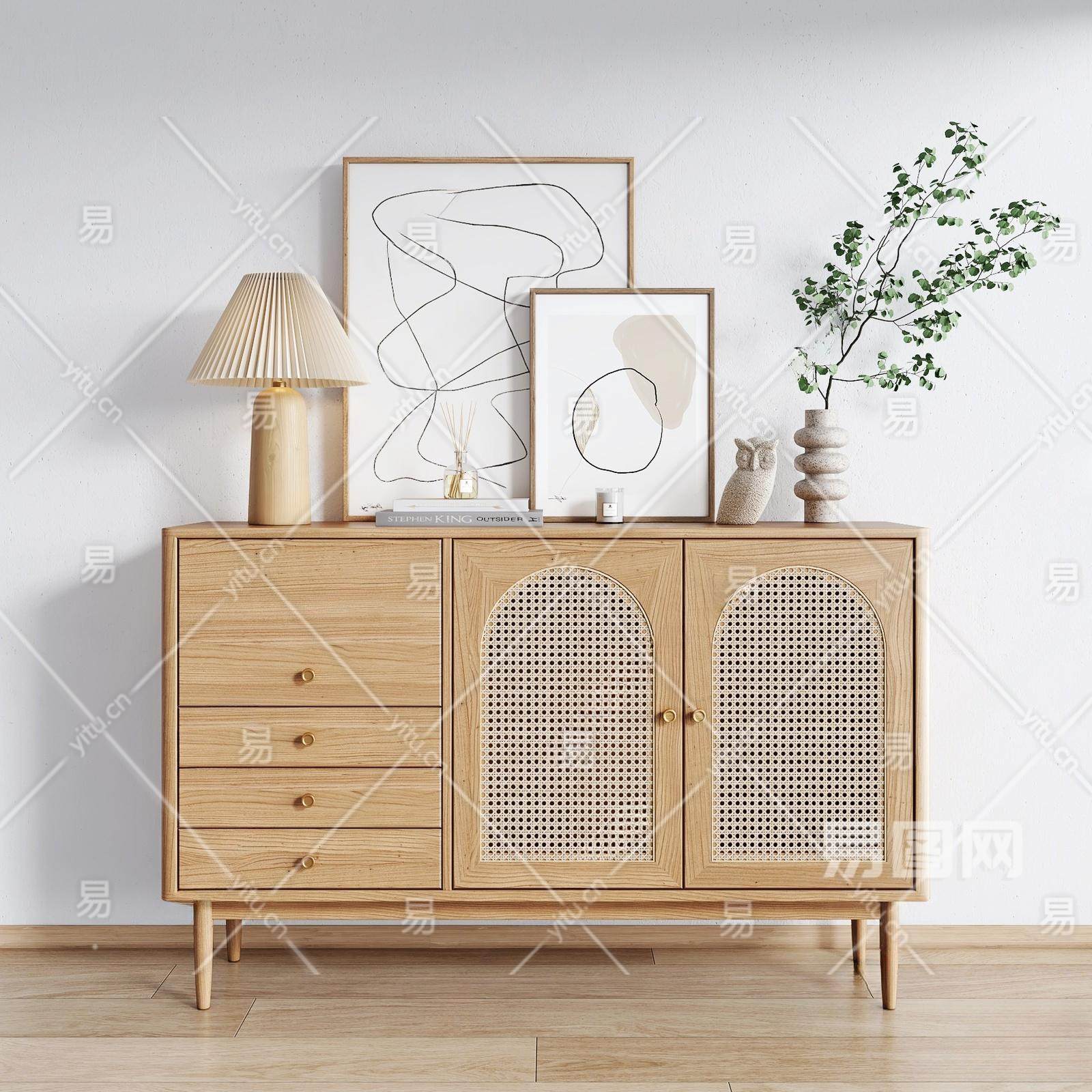 北欧边柜 实木餐边柜 玄关柜 台灯 抽象挂画 花瓶摆件