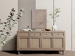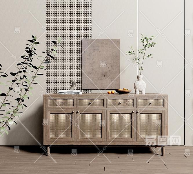 侘寂风格玄关柜 端景柜 储物柜 木材 藤编