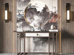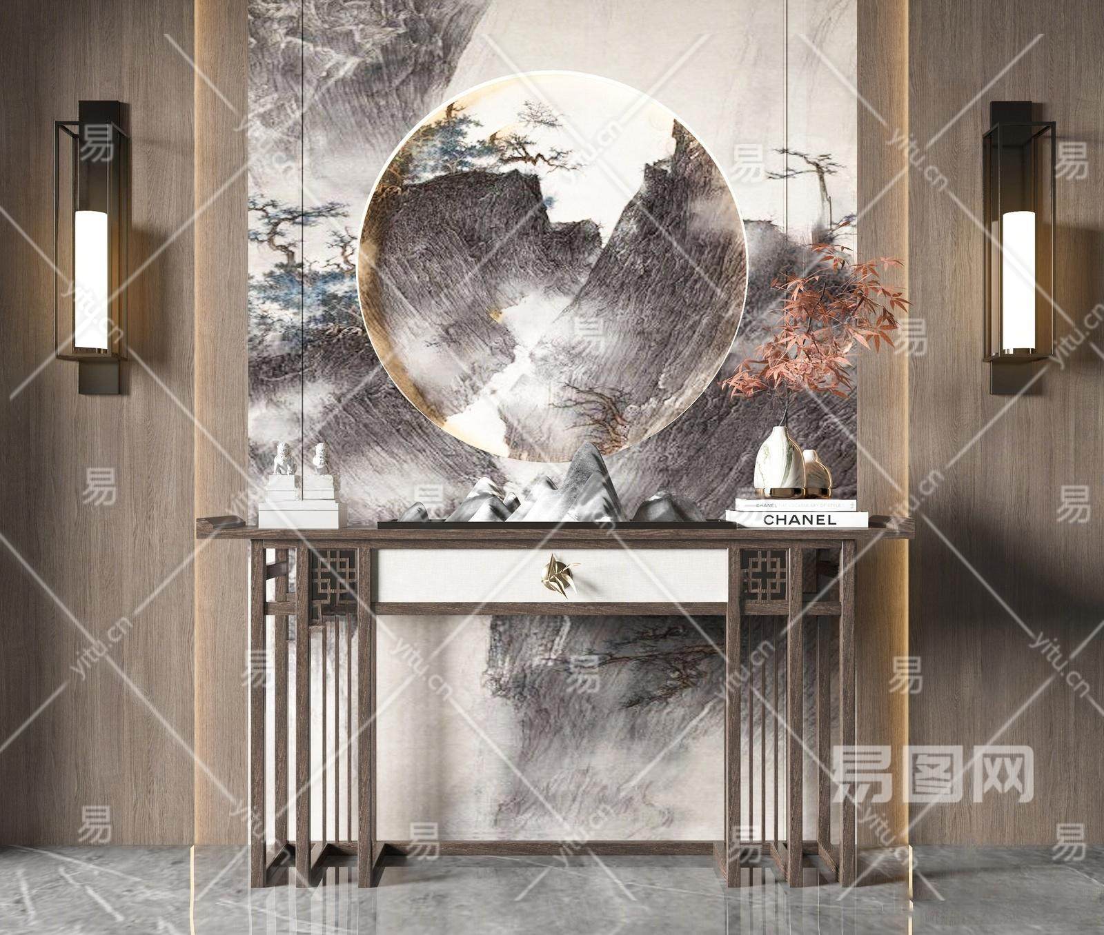新中式端景台 玄关柜 边柜 端景台 装饰柜 壁灯 雕塑摆件 花艺花瓶 木材