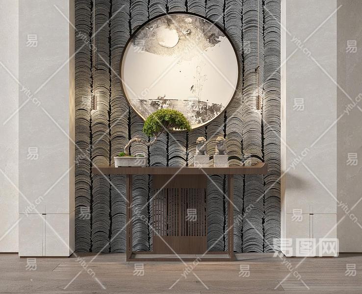 24新中式玄关端景台,盆栽,雕塑摆件SU模型