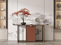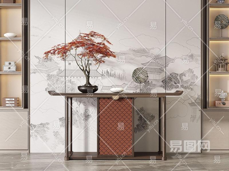 29新中式端景条案玄关柜,花瓶摆件SU模型