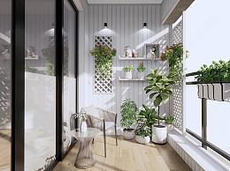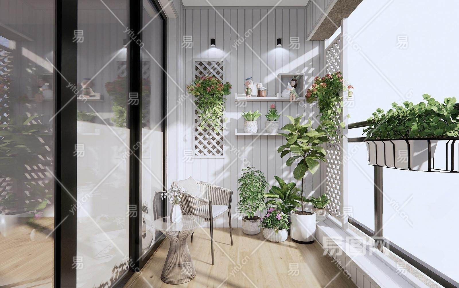 现代家居阳台 植物盆栽 吊篮 休闲桌椅 洗衣机柜 晾衣架
