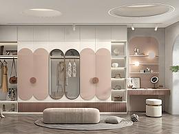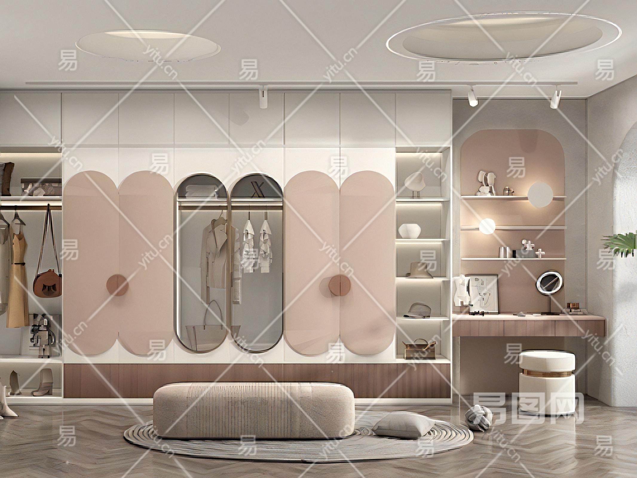 现代衣帽间衣柜梳妆台衣服服饰包包凳子植物摆件吊灯