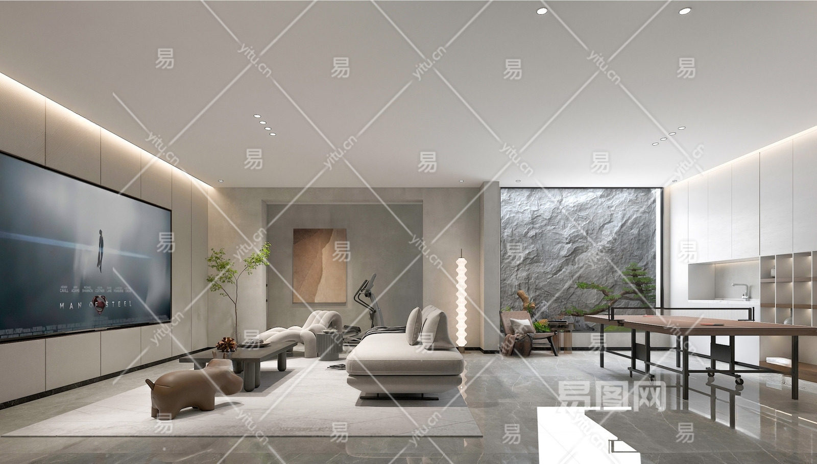 现代地下室影音室 休闲室 乒乓球台 健身器材 天井 运动休闲娱乐空间