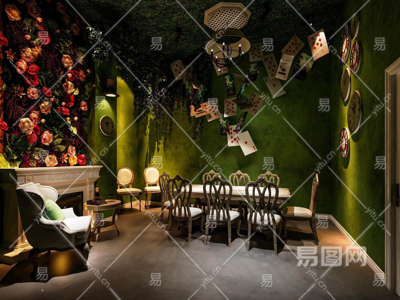 简欧剧本杀主题房 桌游室 推理 三国杀 密室 桌椅 扑克 狼人杀