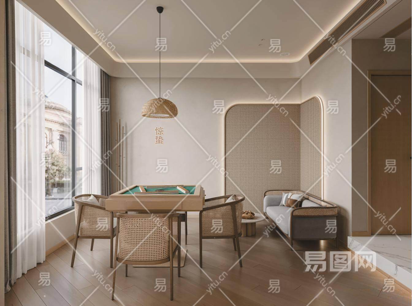 侘寂风棋牌室 麻将室 麻将桌 沙发 装饰柜