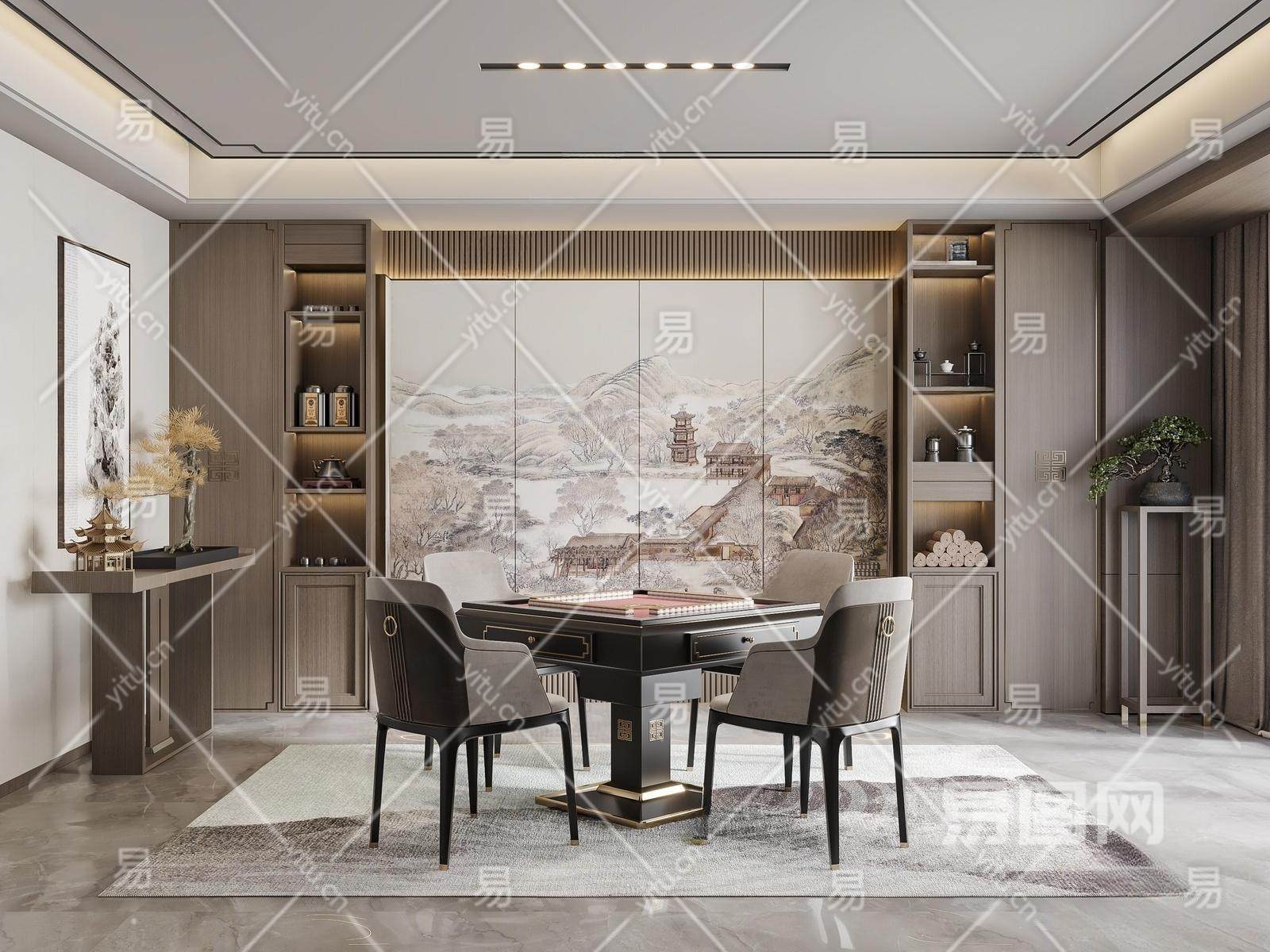 新中式棋牌室 麻将桌 玄关柜 摆件