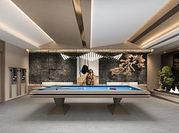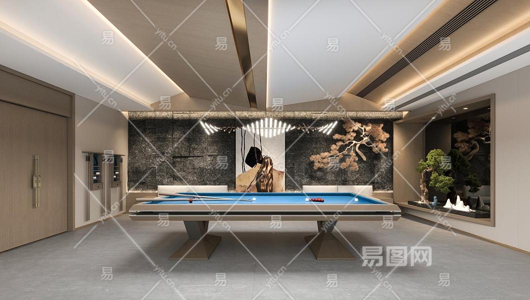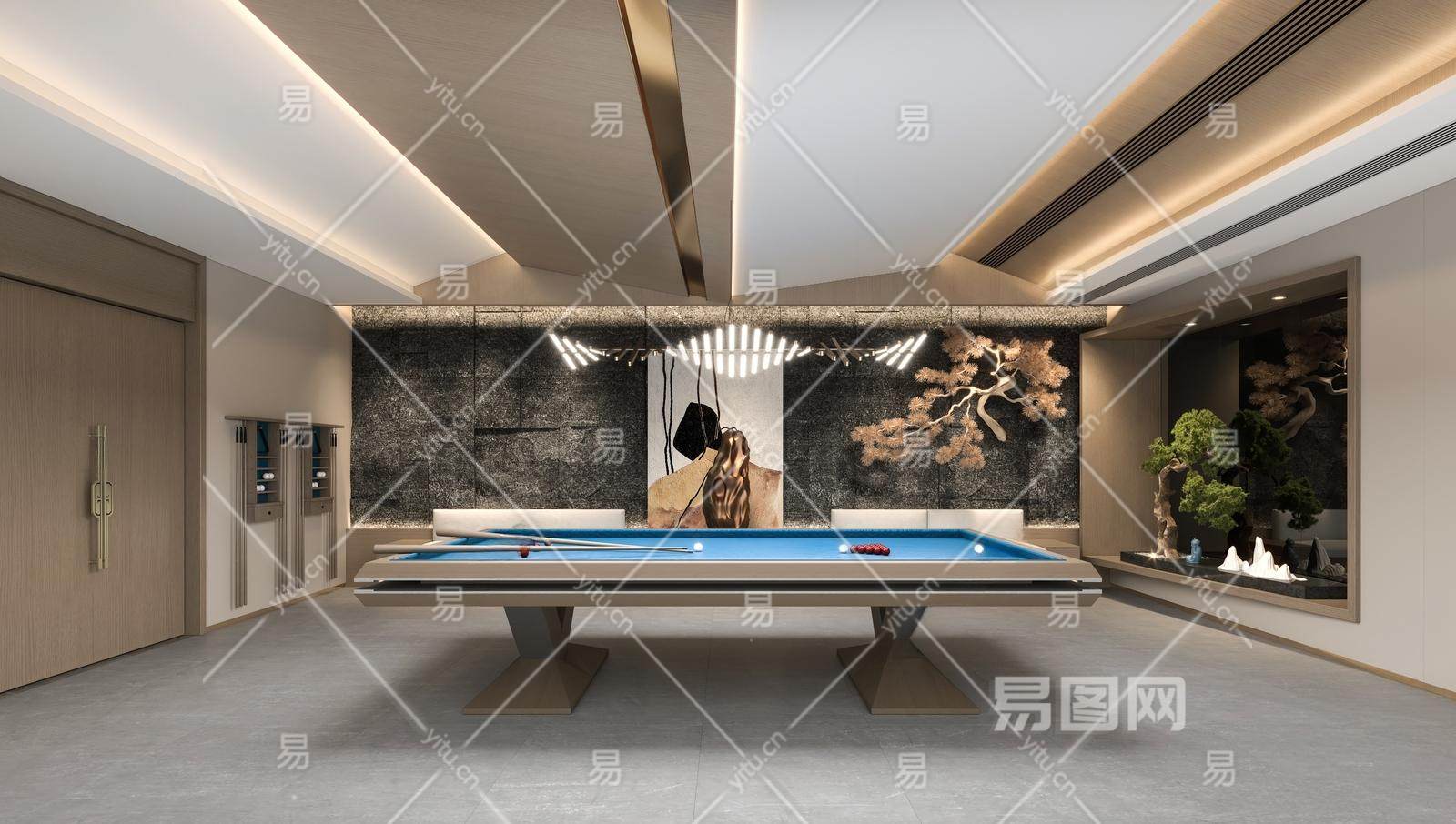 新中式家居台球室 台球桌 吊灯 迎客松盆景