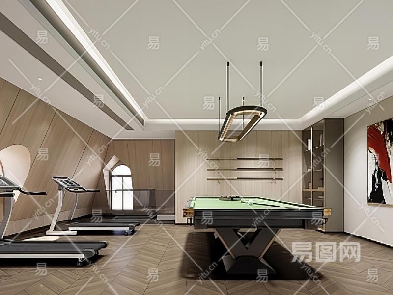 现代台球室 健身房 台球桌 跑步机 台球杆