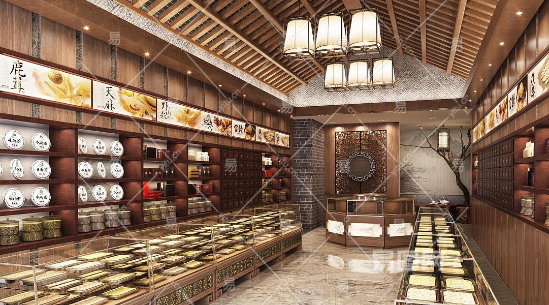 新中式药店 保健药品 产品陈列 展柜 吊灯 背景墙