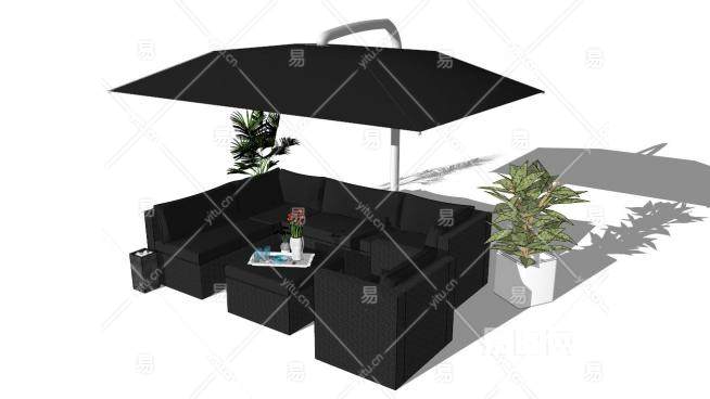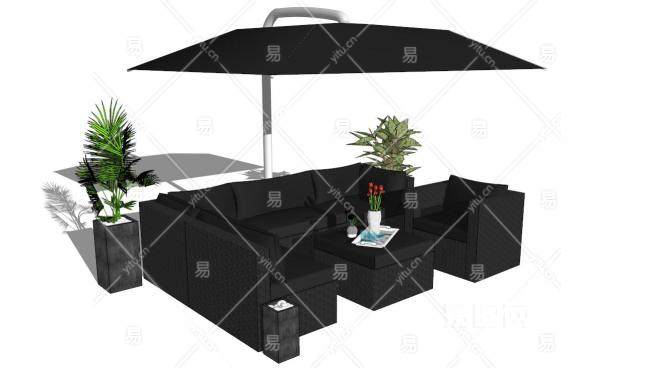 深色遮阳伞室外桌椅组合SU模型下载_sketchup草图大师SKP模型