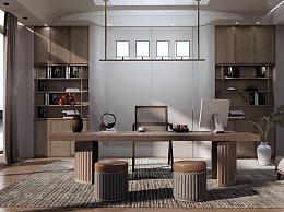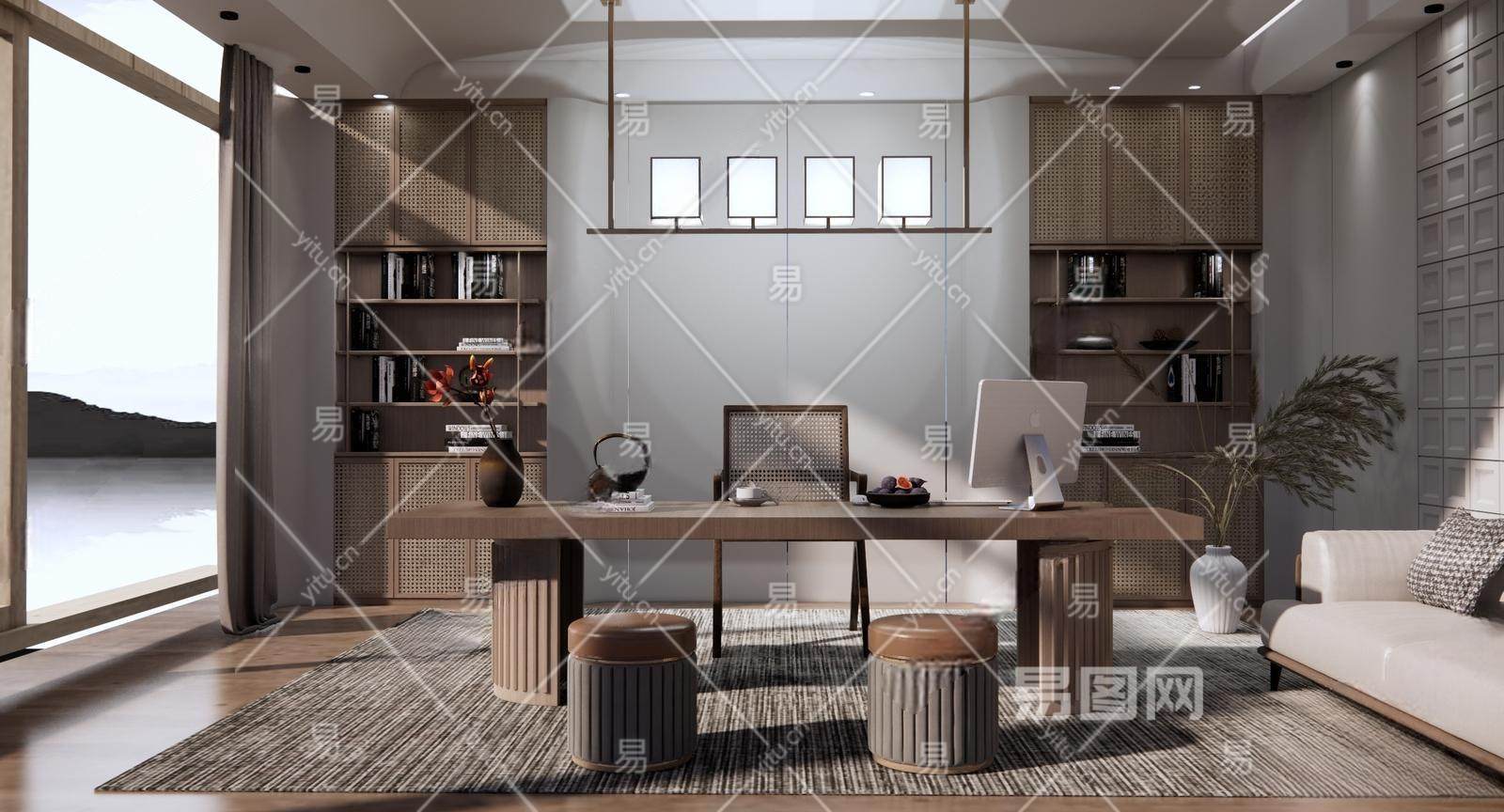 侘寂经理办公室 办公桌椅 茶室 书房 背景墙书柜 沙发 室内盆栽