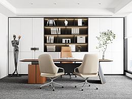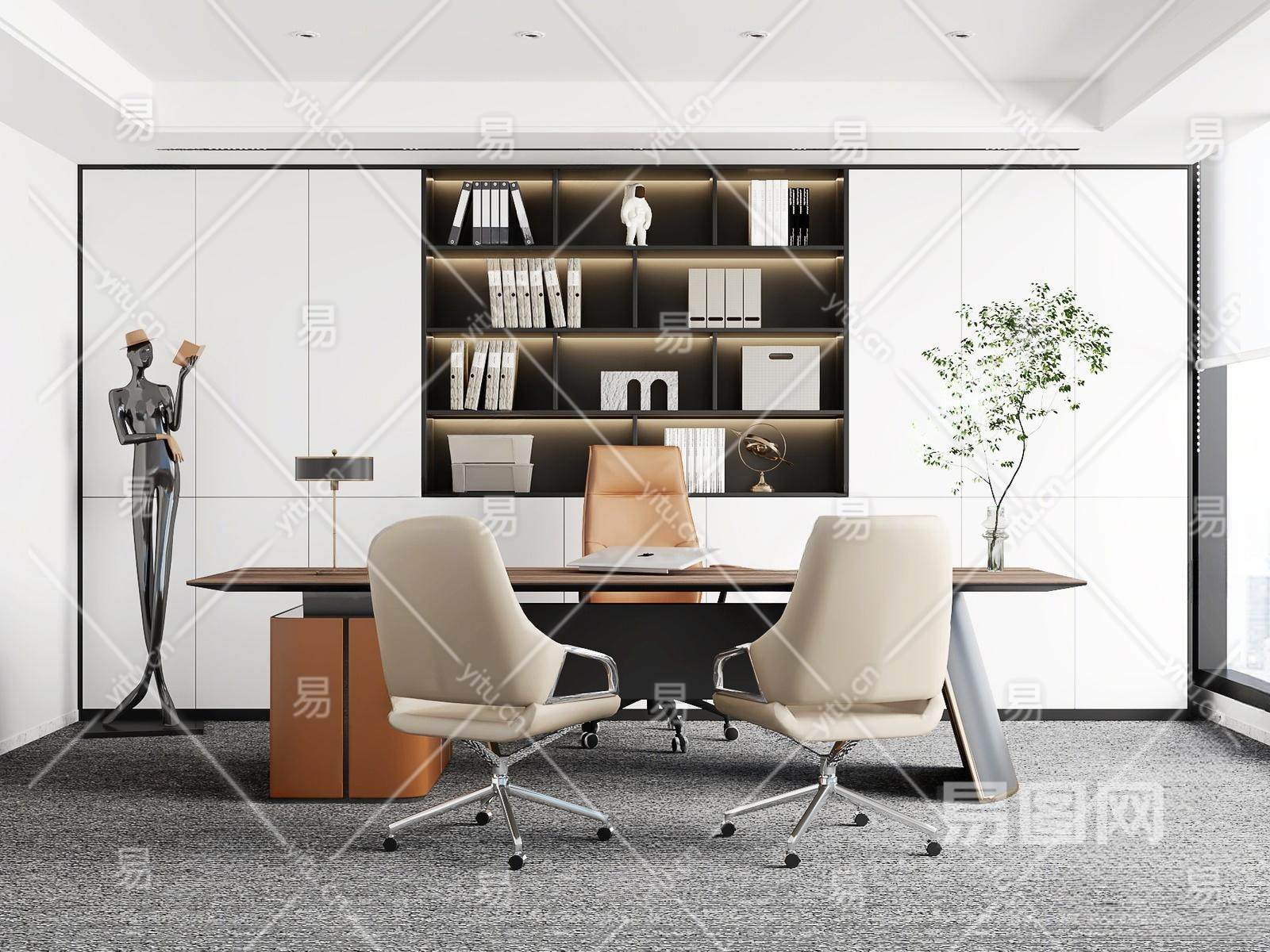 现代经理办公室 董事长办公室 办公桌 办公椅 雕塑 绿植 书柜