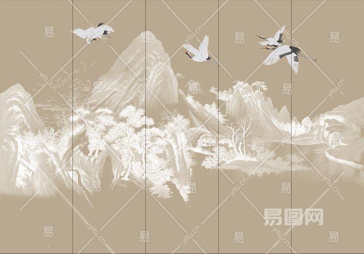 【高清贴图】新中式山脉仙鹤壁纸壁布背景画